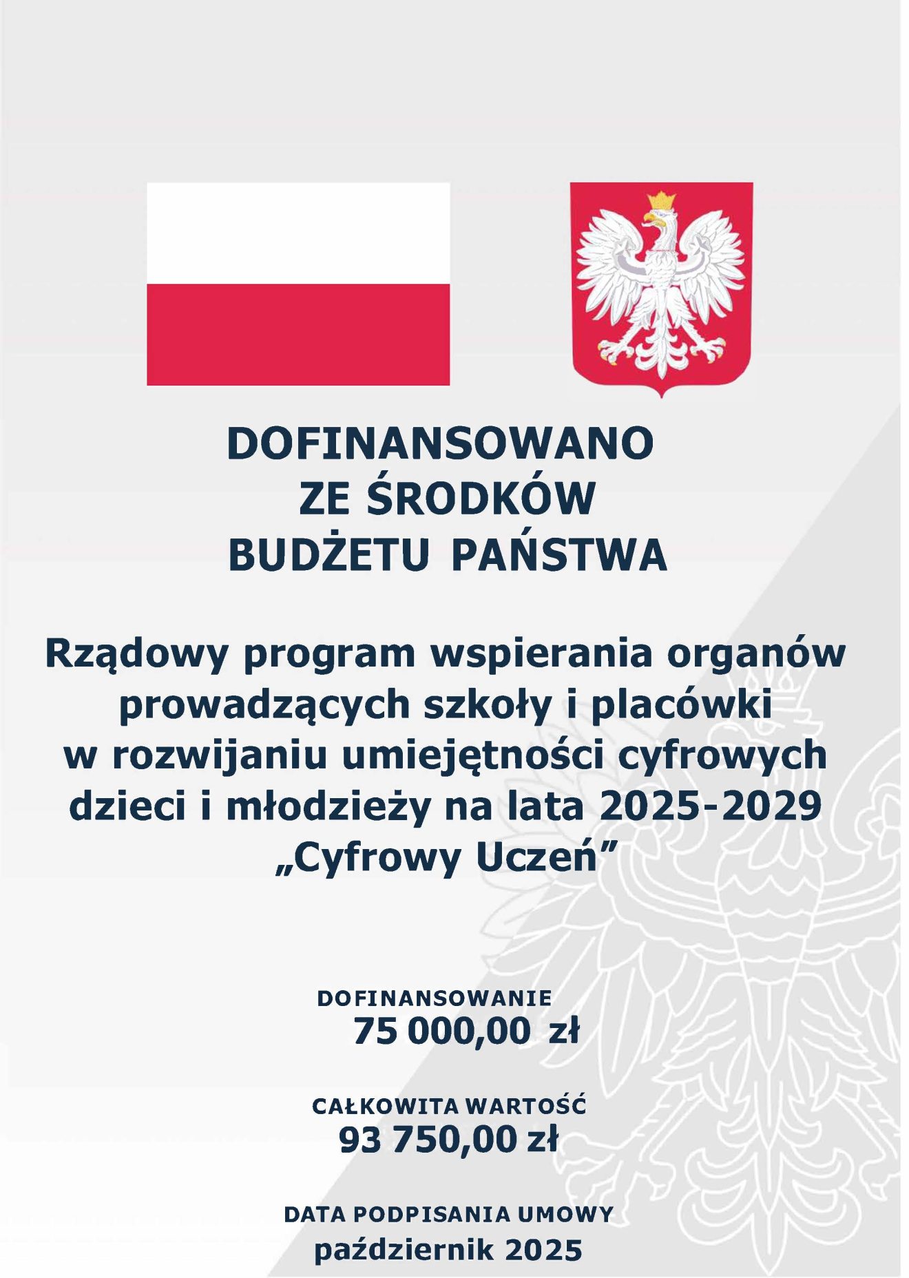 W związku z realizacją Rządowego programu wspierania organów prowadzących szkoły i palcówki w rowijaniu umiejętności cyfrowych dzieci i młodzieży na lata 2025-2029 – „Cyfrowy uczeń”, Powiat Tomaszowski otrzymał wsparcie finansowe w formie dotacji celowej z budżetu państwa w wysokości 75 000,00 zł (data podpisania umowy dotacyjnej – 29 października 2025 r.)